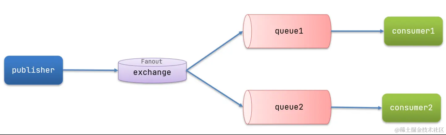 - 交换机吧消息发送给绑定过的所有队列