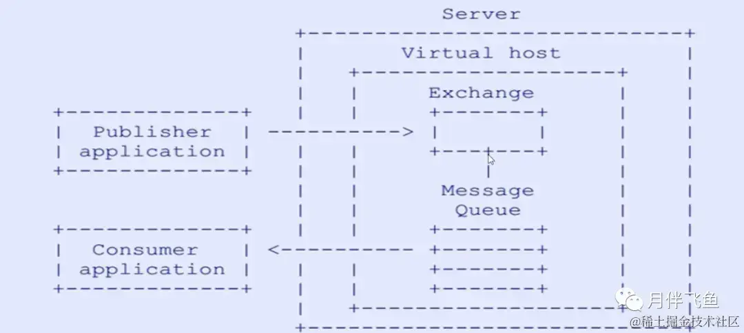 Publisher 推送消息前先与Server建立连接,找到Virtual host,然后将消息推送至Exchange交换机。而交换机与Message Queue有绑定关系(一个交换机相当于一个独立的虚拟机,而这个虚拟机内的各种独立的应用就相当于一个Queue,这个Queue与交换机绑定),Consumer通过绑定的对队列,而交换机也绑定了队列。发送者将消息发送给交换机,这样就能完成消息的推送了