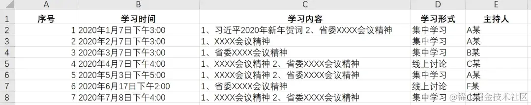 你可以看到,我们成功地将7个Word文件中的四个信息提取出来,并按照序号、学习时间、学习内容、学习形式、主持人的顺序,写入Excel文件中,方便查阅和管理。