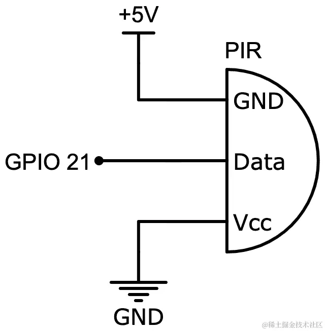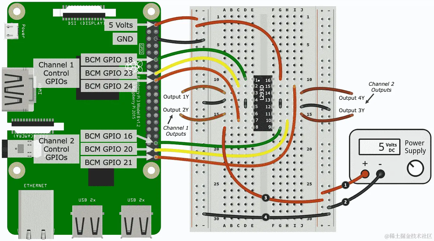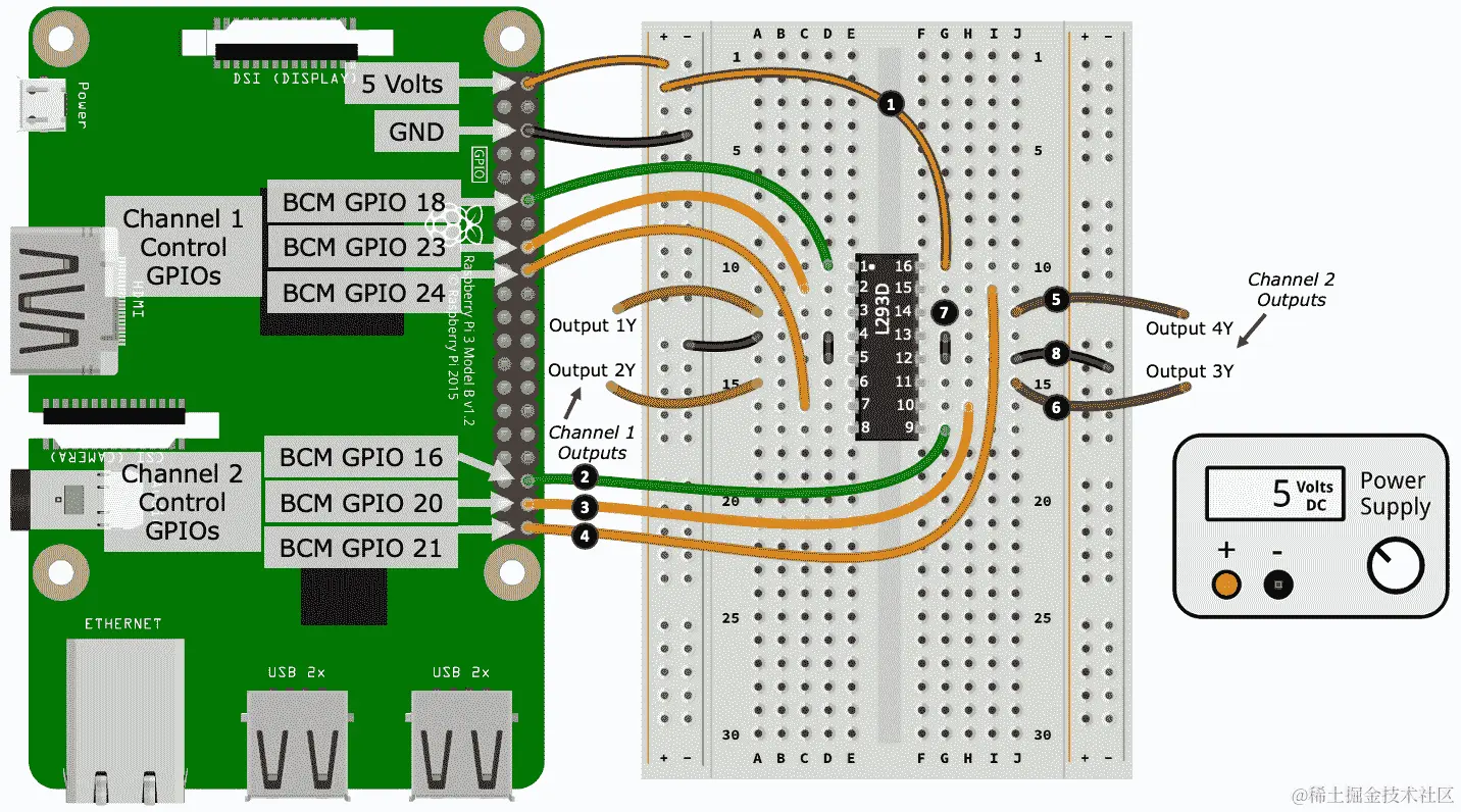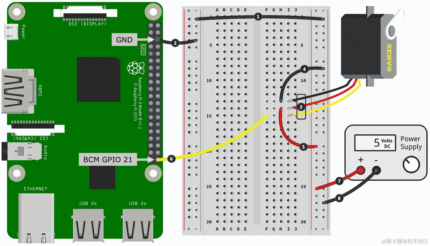 我们舵机示例的第一个任务是将其连接到电源和我们的树莓派。显示这种布线的原理图如下: