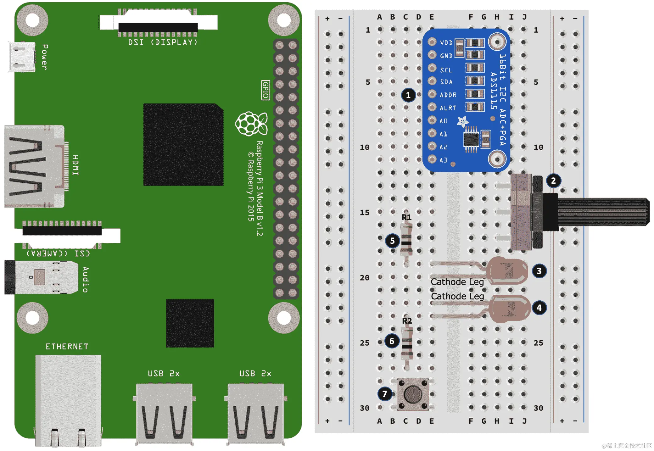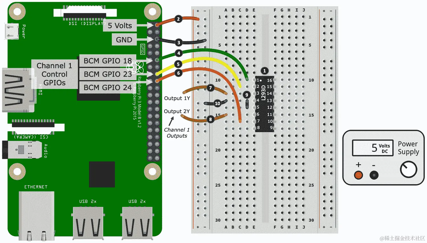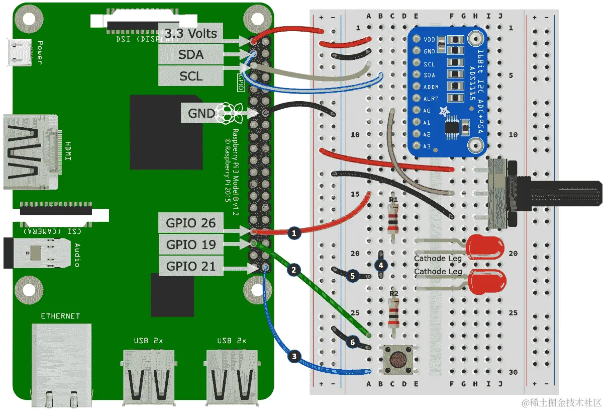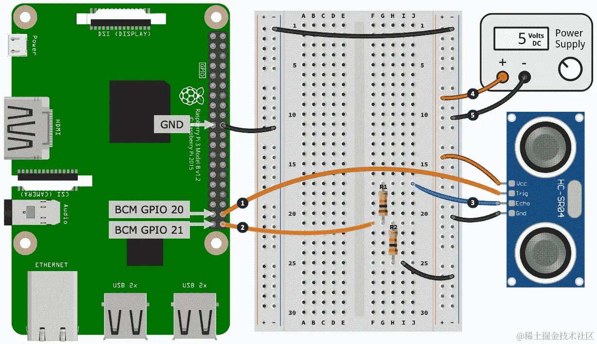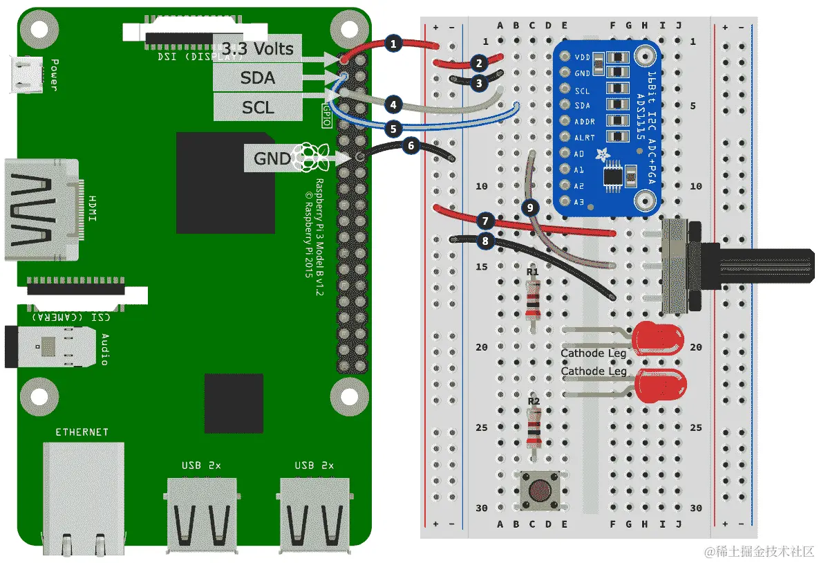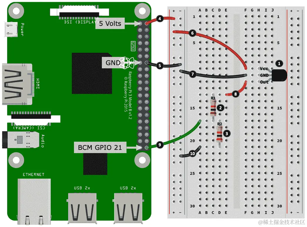 以下是创建面包板构建的步骤。步骤编号与图 10.3中的黑色圆圈中的数字相匹配: