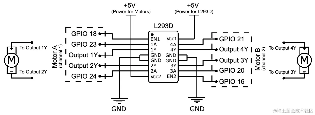1 x L293D 集成电路(IC)(确保它带有 D - 也就是 L293D,而不是 L293)。参考资料表: