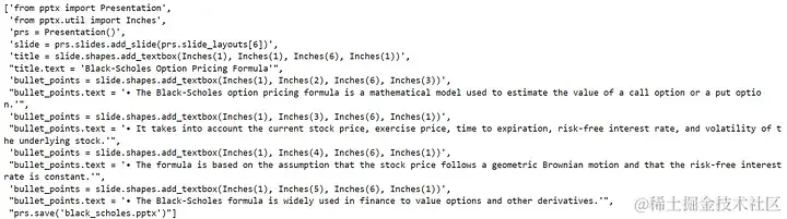 现在将 LLM 的输出传递到另一个 LLM 调用中,该调用将输出 python-pptx 代码。