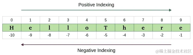 因此,为了获取最后一个元素,我们需要知道整个列表(或元组、字符串等)的长度,然后减去1。因此:len(a) - 1。这是一个非常常见的操作,Python 提供了一种使用负索引检索元素的方法。这在进行数据操作时非常有用。下面是一个关于字符串"HelloThere"(这是 Obi-Wan Kenobi 讽刺地向 Grievous 将军问候)的索引工作的漂亮图表: