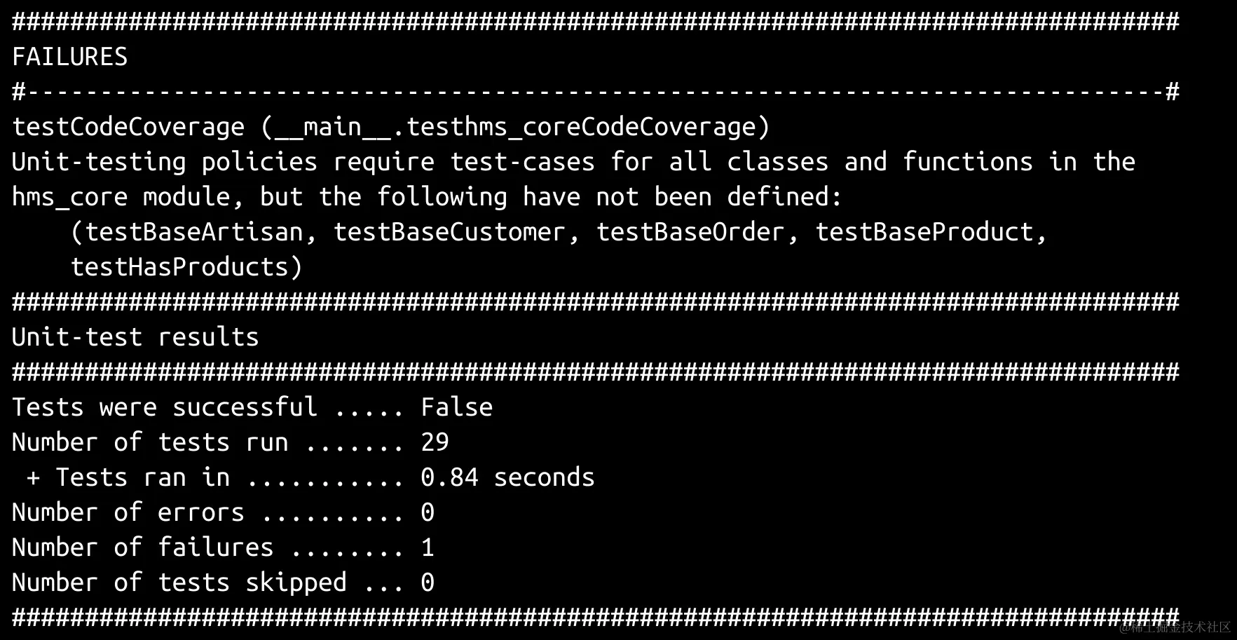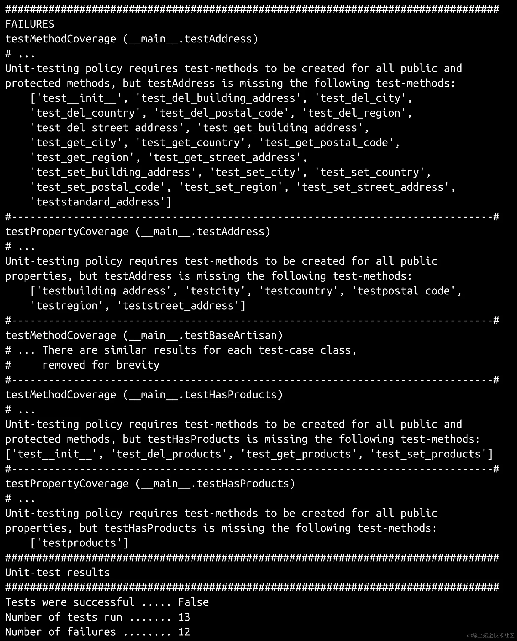 然后,测试运行输出告诉我们,我们需要为被测试模块中定义的六个类生成测试用例类;具体来说,我们需要创建testAddress、testBaseArtisan、testBaseCustomer、testBaseOrder、testBaseProduct和testHasProducts测试用例类。3