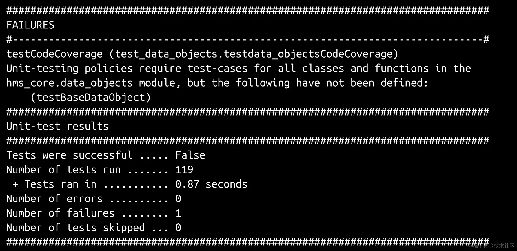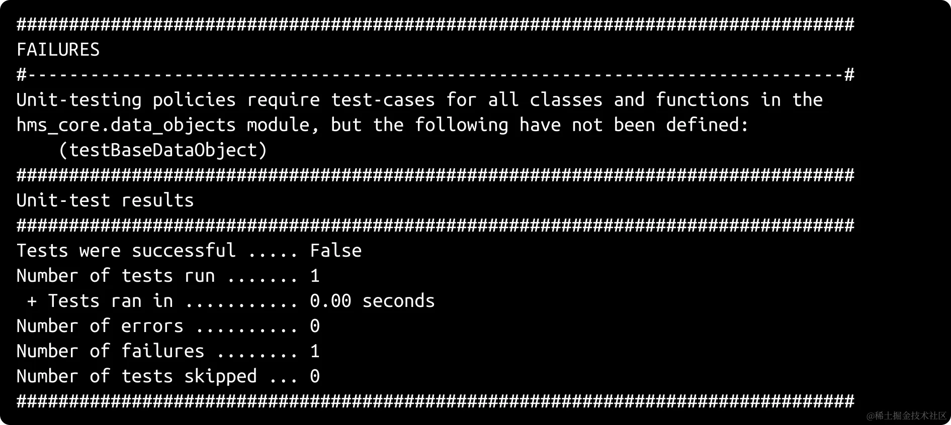 一旦这些测试就位,重新运行测试模块将生成一个(很长的!)需要在测试策略测试通过之前解决的项目清单。需求的完整清单足够长,直接包含在书中只会导致 2-3 页的项目符号列表。然而,完整的结果包含在hms_core代码库的miscellany/initial-test-run.txt中。整个初始输出太长,无法在此处完整重现,但输出的开头和结尾如下,并指定了需要在六个测试用例类中实现的总共 105 个测试方法: