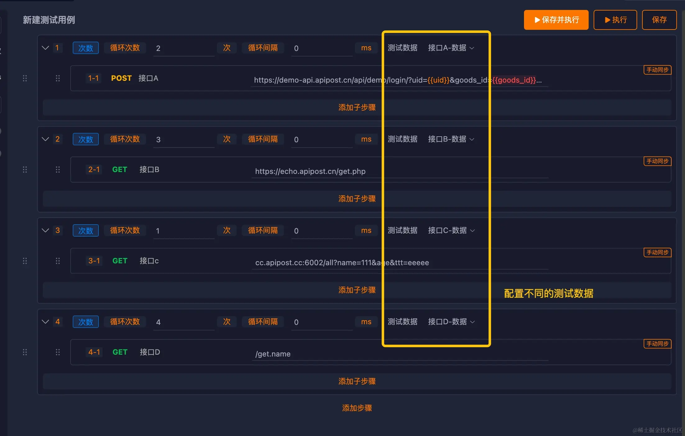 如果需要运行接口A两次,接口B三次,接口C一次,接口D四次,可以按照下图所示分别设置局部测试数据: