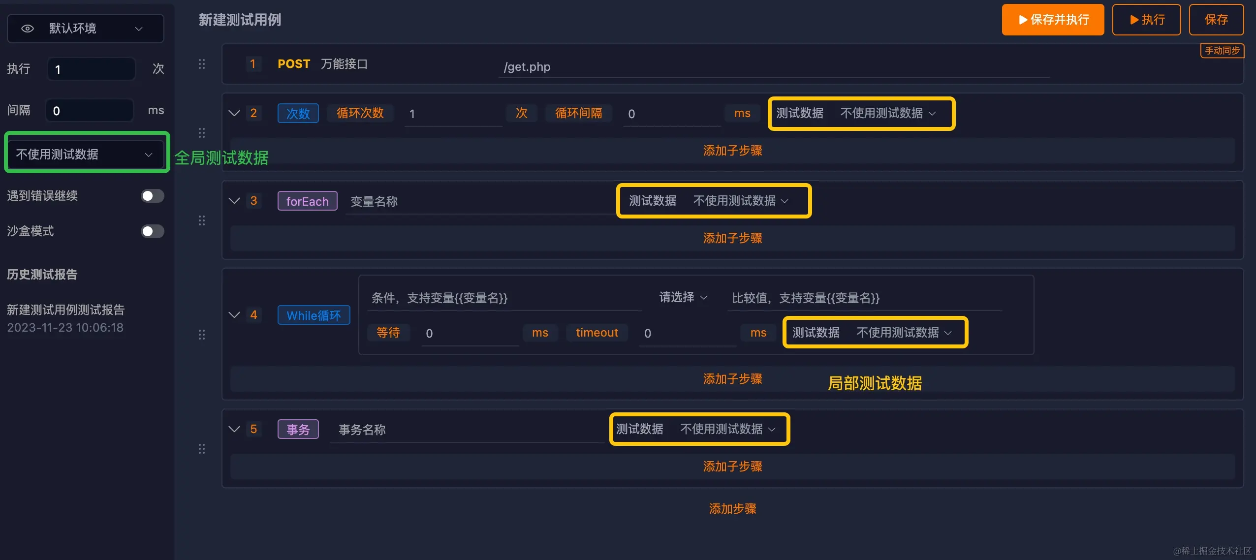 Apipost的自动化测试模块是针对测试人员的复杂业务的测试服务,除了可以设置全局的公用测试数据外,次数循环、while循环、事物分组控制器等控制器还支持单独设置局部的测试数据。