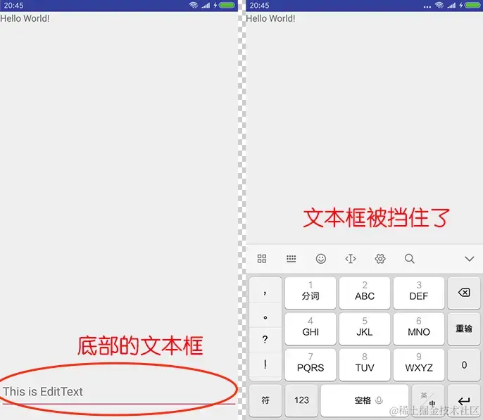 与ios不同的是,android默认软键盘弹出时页面是不会被向上推起的,这样会导致软键盘遮挡住输入框,带来不好的用户体验。