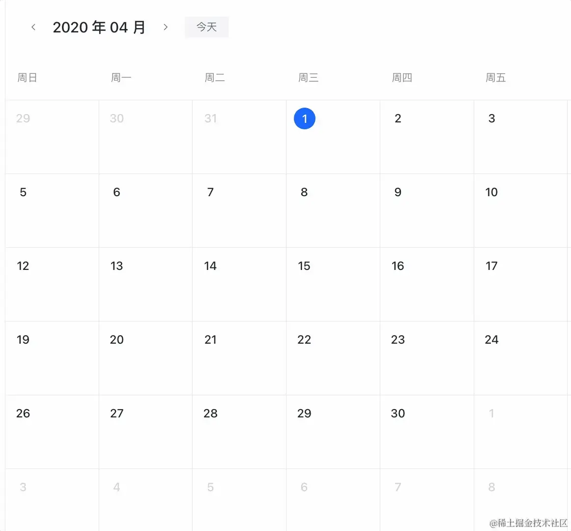 接下来就是日期渲染了,日期渲染就是拿到第一天的日期,计算是星期几,然后把前面空余的数据填补成上个月的末尾日期,后面超出的数据填补成下个月月初日期