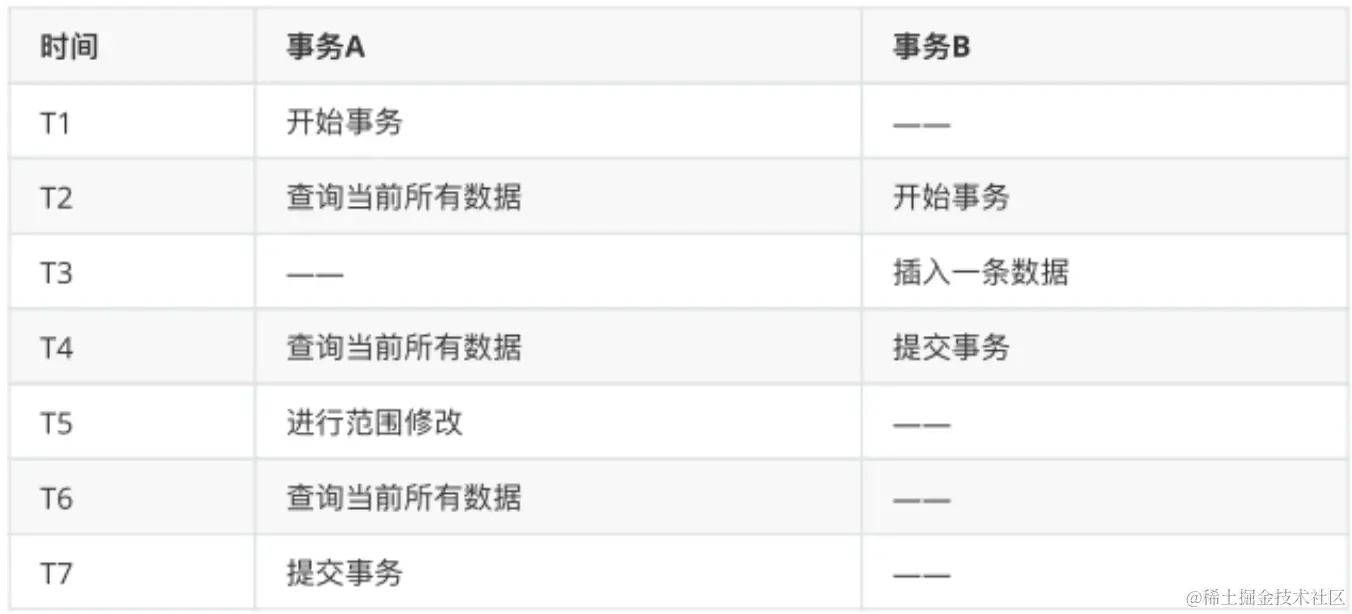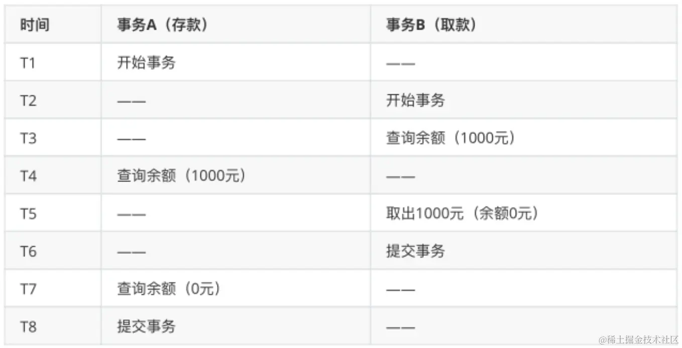 在事务A和事务B同时执行时可能会出现如下场景: