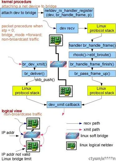 如图所示,Bridge的功能主要在内核里实现。当一个从设备被attach到Bridge上时,相当于现实世界里交换机的端口被插入了一根连有终端的网线。这时在内核程序里,netdev_rx_handler_register()被调用,一个用于接受数据的回调函数被注册。以后每当这个从设备收到数据时都会调用这个函数可以把数据转发到Bridge上。当Bridge接收到此数据时,br_handle_frame()被调用,进行一个和现实世界中的交换机类似的处理过程:判断包的类别(广播/单点),查找内部MAC端口映射表,定位目标端口号,将数据转发到目标端口或丢弃,自动更新内部MAC端口映射表以自我学习。
