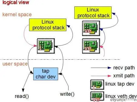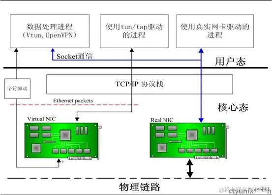 Tap驱动程序中包含两个部分,一部分是字符设备驱动,还有一部分是网卡驱动部分。利用网卡驱动部分接收来自TCP/IP协议栈的网络分包并发送或者反过来将接收到的网络分包传给协议栈处理,而字符驱动部分则将网络分包在内核与用户态之间传送,模拟物理链路的数据接收和发送。Tap驱动很好的实现了两种驱动的结合。