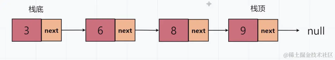 push方法将元素添加到栈的顶部,即链表的头部。