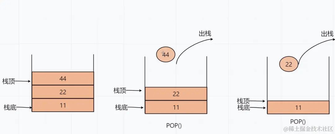出栈操作(pop)就是把元素从栈中弹出,只有栈顶元素才允许出栈,出栈元素的前一个元素将会成为新的栈顶。