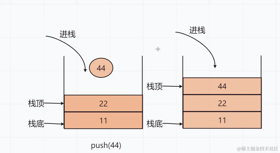 入栈操作(push)就是把新元素放入栈中,只允许从栈顶一侧放入元素,新元素的位置将会成为新的栈顶
