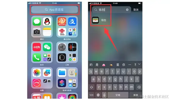 如果我们找不到**【钱包】app在哪,我们可以通过【App资源库】**来搜索。
