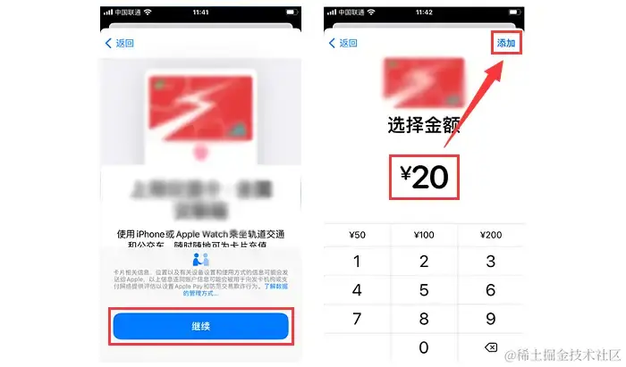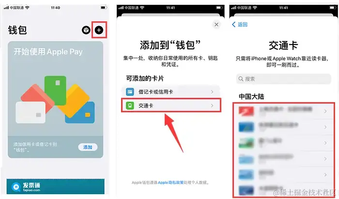 打开**【钱包】界面后,单击该界面右上角的【+】按钮。点击【交通卡】**,选择其中一张交通卡进入下一个页面。