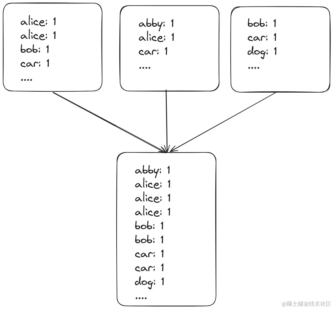 map 函数将输入文本拆分为单词并发出键值对。例如,“the quick brown fox jumps over the lazy dog” 映射到以下键值对:[“the”:1, “quick”:1, “brown”:1, “fox”:1, “jumps”: 1, “over”:1, “the”:1, “lazy”:1, “dog”:1]。请注意,对 (“the”: 1) 发射了两次。