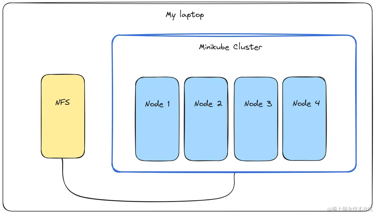 由于我是出于教育目的开发这个概念,所以我使用 minikube 在我的笔记本电脑上启动一个本地虚拟集群。我在集群外将我的 NFS 服务器作为一个 docker 容器运行,并通过 docker 网络将其连接到该集群。此设置的优点是它可以轻松迁移到多个物理或虚拟机。
