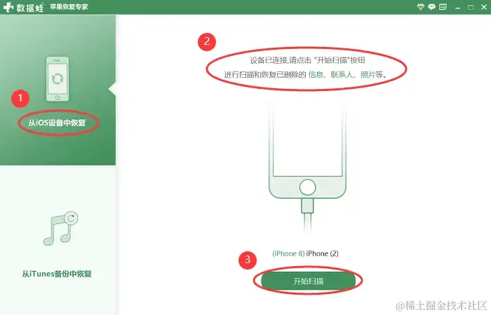 步骤1:首先,选择信誉良好、用户评价较高的软件,以保证恢复过程的安全性和有效性。这里在电脑安装的是【数据蛙苹果恢复专家】软件,根据界面提示,进行设备的连接与开始扫描步骤。