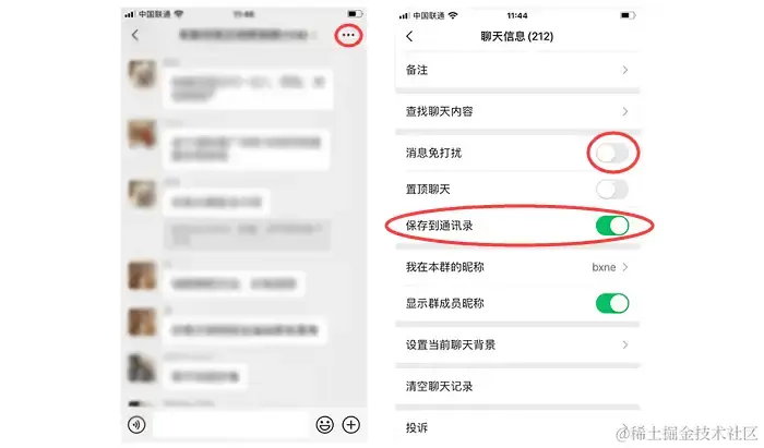 PS:想要更好的保存新建的群聊,我们可以点击群聊右上角的【三个点】图标,进入设置菜单。如果你开启了【消息免打扰】,记得关闭它。然后开启【保存到通讯录】,方便后续找到该群。