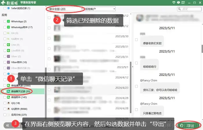 步骤3:选择了要恢复的聊天记录后,点击**【导出】**按钮,再选择数据保存的路径,将其保存到您的电脑中。