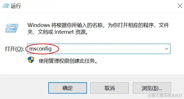 2)输入【msconfig】 ,然后点击 【确定】;