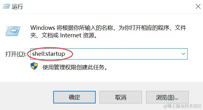 1)按组合键 【win+R】唤出运行窗口,输入 【shell:startup】点击确认,打开启动项文件夹;