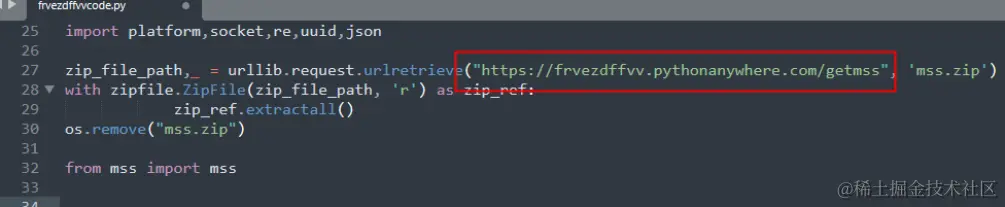 首先从攻击者服务器(frvezdffvv.pythonanywhere.com/getmss)下载py… mss模块安装包(mss.zip)到目标系统中,并对安装包进行解压。