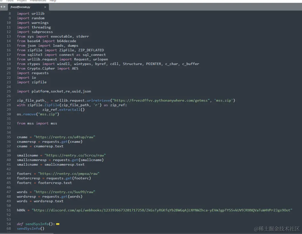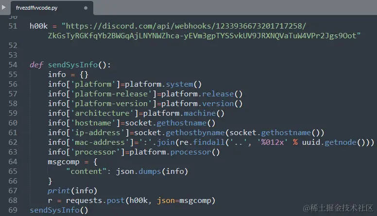 通过python内置platform和socket模块获取操作系统版本、处理器、网卡MAC、网络IP地址、主机名等敏感信息,并将数据外传到投毒者webhook接口(discord.com/api/webhook…