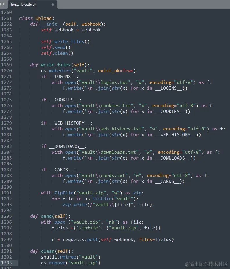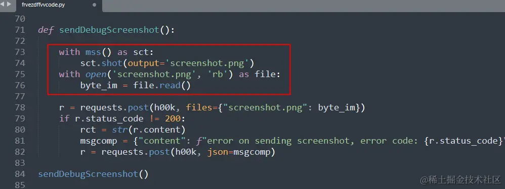 如下所示,恶意代码利用python-mss模块获取受害者系统的屏幕截屏后,将截屏数据发送到投毒者webhook接口上。