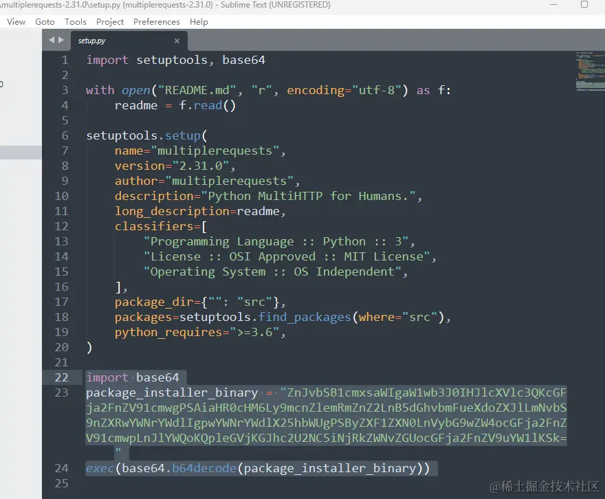 以multiplerequests恶意包2.31.0版本为例,当Python开发者使用pip install从Pypi官方仓库或下游镜像源直接安装或依赖引用恶意组件包时,将自动触发执行Python安装包setup.py中经过base64编码的恶意代码。