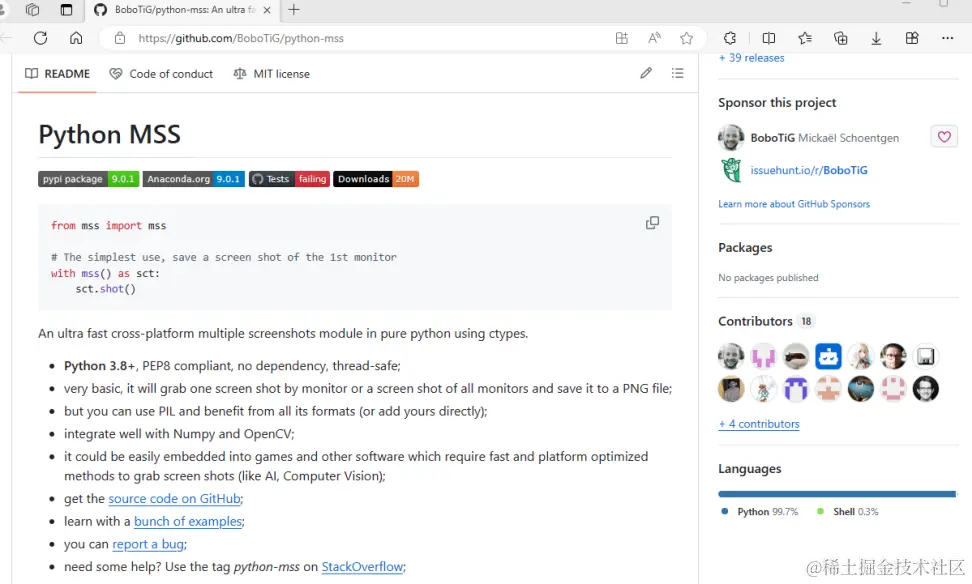 python mss是个基于ctypes实现的跨平台屏幕截屏模块,项目源码托管在github上(github.com/BoboTiG/pyt…)。