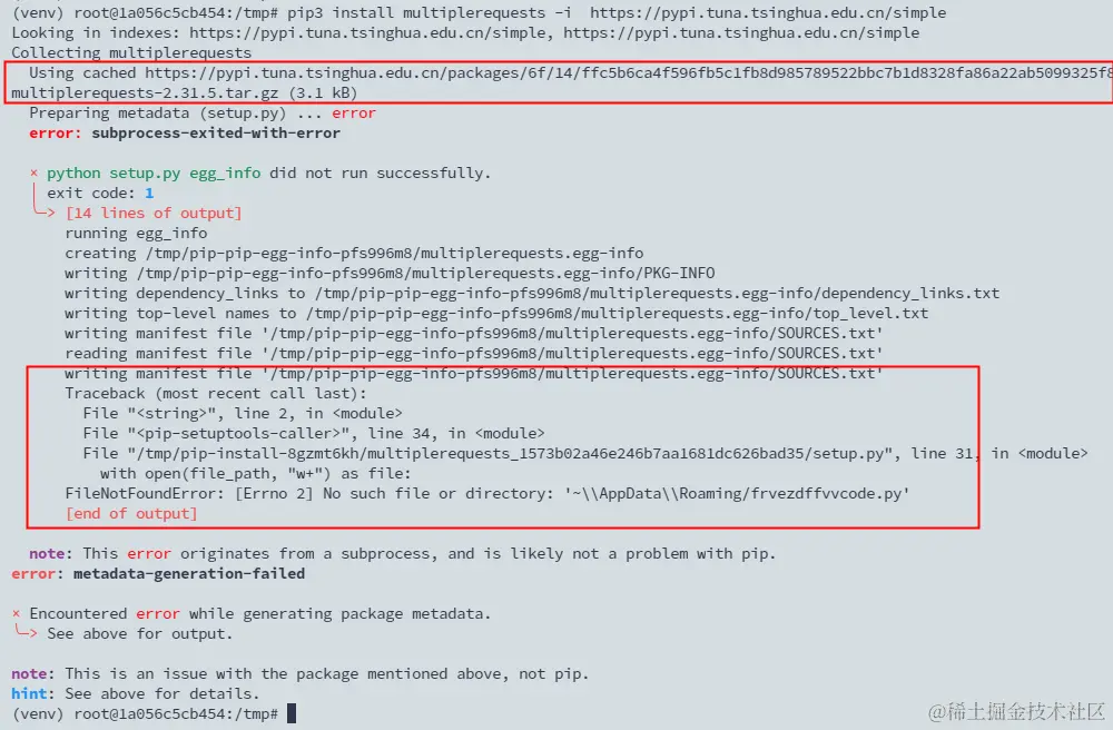 由于该恶意Py包只针对Windows系统,测试环境使用Linux系统,导致恶意包安装过程中触发恶意代码时触发非预期的Windows系统路径(~\AppData\Roaming/frvezdffvvcode.py) 的文件写入操作。