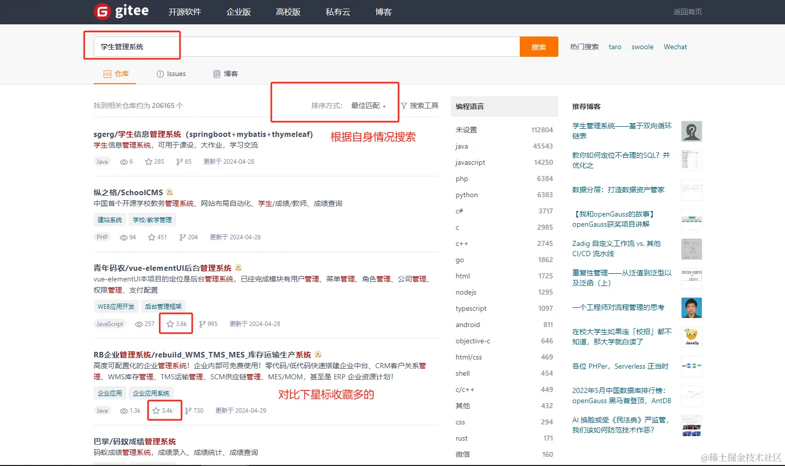 善于运用辅助搜索,搜索开源代码。例如要做一个【学生管理系统】,就去Gitee/Github网站去搜索,查看有无符合要求或贴近需求的代码。善于利用排序方式,能够筛选出更加匹配的源码。