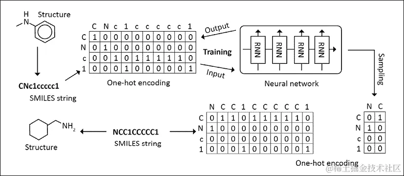回到化学图的编码,也许不足为奇,我们可以使用基于循环神经网络(如 LSTM)的生成模型,从可能的分子图构型的巨大空间中采样。因为分子遵循特定的结构主题,这个问题比简单地独立采样原子集合更复杂,因为它们必须按照化学结构约束形成一个连贯的分子。图 13.3说明了这个过程可能是什么样子;将 2D 结构编码成二进制特征向量(有点类似我们在早期章节看到的文本表示),然后通过循环神经网络运行这些向量,训练一个根据先前的原子/键预测下一个原子或键的模型。一旦模型在输入数据上训练完成,它就可以被用来通过从这个生成器中一次次采样新结构来生成新的分子。变分自动编码器(第五章,使用 VAE 画图)也已经被用来生成分子⁴(图 13.4),同样生成对抗网络⁵(图 13.5),我们在第六章,使用 GAN 生成图像中介绍过。