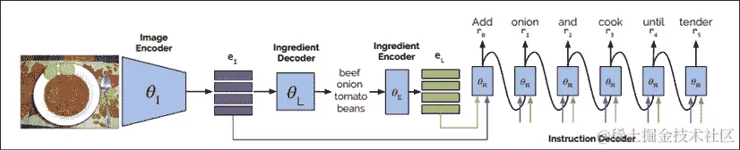 像我们在前几章看到的许多例子一样,“编码器”网络接收图像作为输入,然后使用序列模型“解码”成食物成分的文本表示,这些成分与图像嵌入组合在一起,创建由网络的第三层解码的一组指令。这个“指令解码器”使用了我们在第十章中描述的 transformer 架构,NLP 2.0: 使用 Transformer 生成文本,在我们讨论 BERT 时,对图像的不同部分应用加权相关性,并输出成分清单。