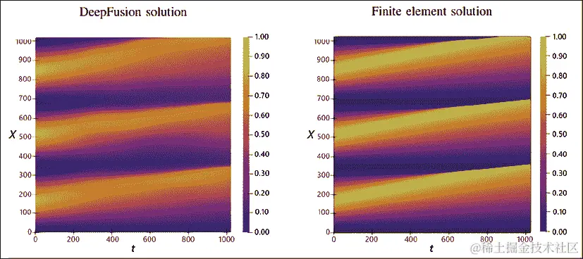图 13.9:使用 FEM 方法解决 Burger 的无黏方程(右)和深度学习(左)¹²