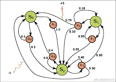 图 12.2:马尔可夫决策过程(MDP)³。通过具有一定概率的行动(橙色圆圈)之间的状态(绿色圆圈)的转移(黑色箭头)得到奖励(橙色箭头)。