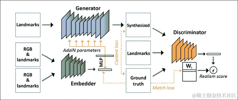 这个架构有三个处理一组输入视频的网络。第一个生成地标特征的嵌入(面部的简化表示,例如轮廓和重要特征的位置,如眼睛和鼻子的位置),以及原始图像的像素,生成数值向量。第二个使用这个嵌入和图像和地标数据作为输入生成新的视频帧。最后,通过鉴别器将下一帧视频与这个生成的图像进行比较。