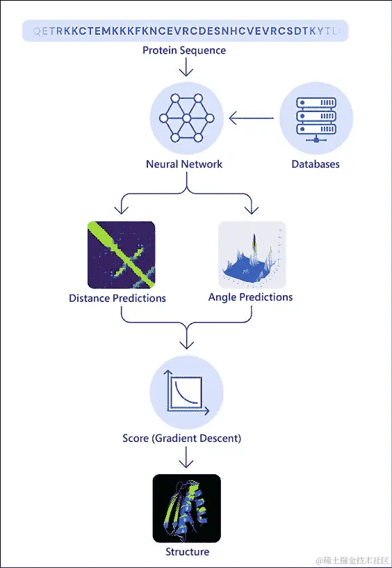 在这里,生成式人工智能也可以帮助:DeepMind(谷歌的研究子公司,也负责 AlphaGo 和其他突破性成果)的研究人员最近发布了一个名为AlphaFold的程序,它可以直接从蛋白质的遗传序列解决蛋白质的三维结构,使研究人员可以绕过实验晶体学的繁琐过程。图 13.6 说明了这是如何实现的:首先,一个网络被训练来从蛋白质的线性序列代码中预测蛋白质内的三维氨基酸(蛋白质的组成单位)之间的距离,表示折叠结构中各部分之间最可能的角度和距离: