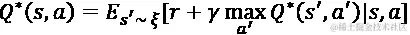 其中 Q* 是“最优”的 Q 函数,E 是期望值,而 是从中采样未来状态 s' 的环境。这个表达式表示最优的 Q 函数应该给出当前序列和提议动作的期望值,作为当前奖励 r 和下一系列动作的折现未来值 Q*(s', a') 之和的期望值。这个表达式也被称为函数表达式,因为解决方案是函数 Q*,因此这个一般类问题称为“Q 学习”。⁷ 在 Q 学习中解决 Q* 的一种方法是通过值迭代: