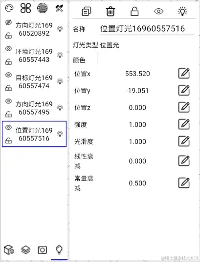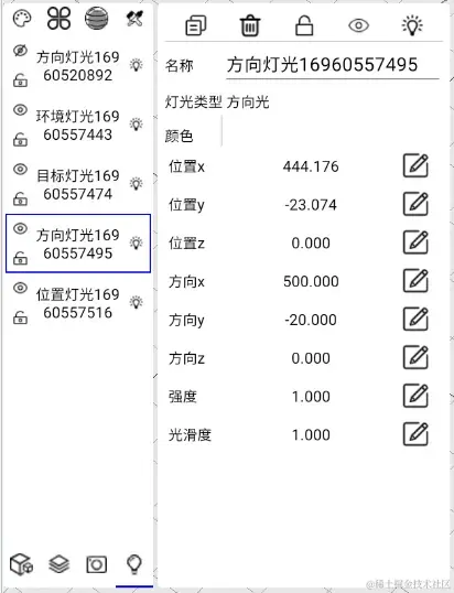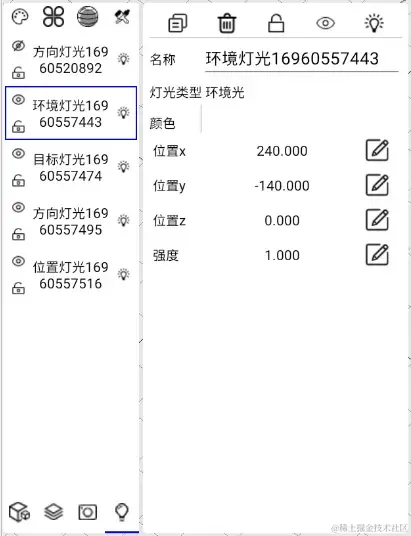 列表显示场景中所有灯光。场景有一个默认灯光。但不会在这个灯光列表列出。可以通过主页->设置->配置页面打开或者关闭这个默认灯光。可以通过右侧建模工具栏的灯光和相机工具按钮打开灯光和相机工具栏,添加不同的灯光,最多能添加6个灯光。