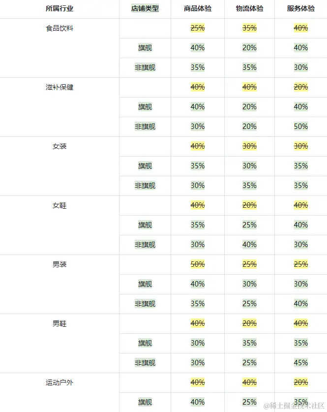 商家体验分是基于商品体验、物流体验、服务体验三个维度加权计算得出,不同行业商品体验、物流体验和服务体验考核权重存在差异,详细参考下表。同时,部分行业会基于店铺类型是否为旗舰店,进行拆分考核: