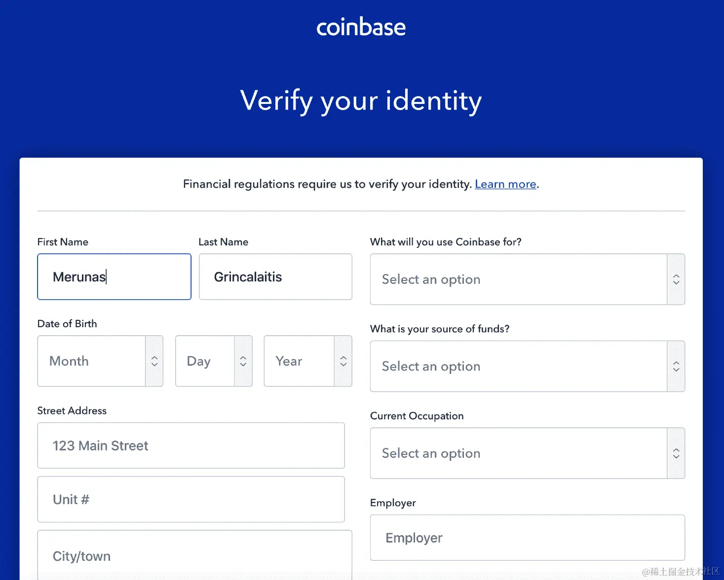 - 在那个大输入框中键入您的电子邮件地址,然后单击“开始”以创建新的 Coinbase 账户。然后,它会要求您提供更多所需的详细信息,以便您可以开始: