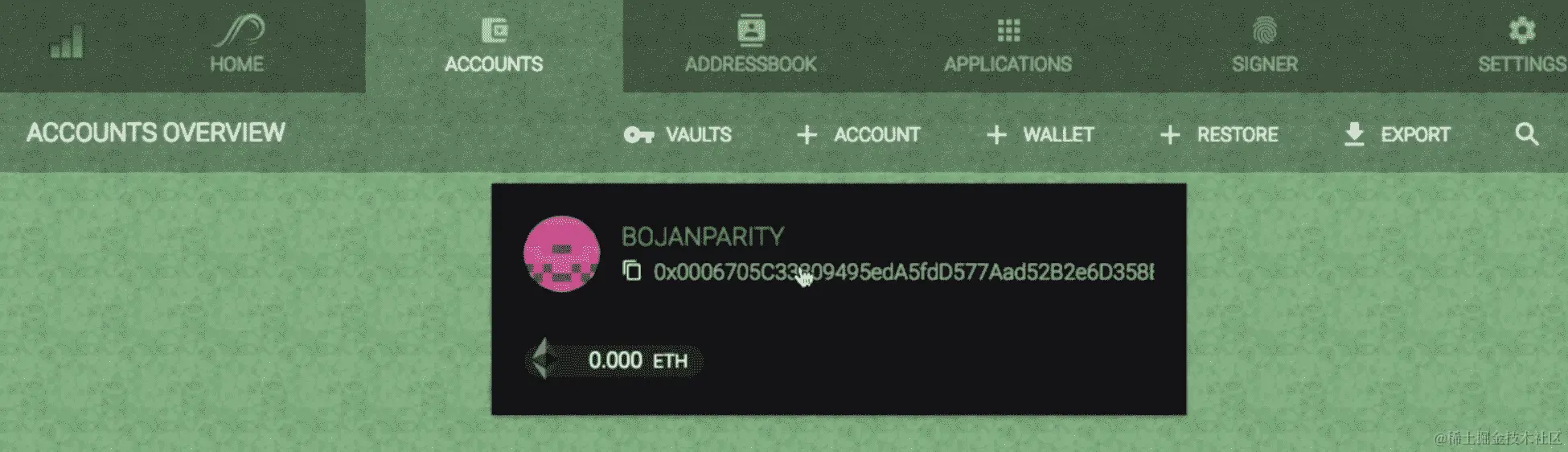 要与此类钱包交互,只需打开 Parity 的 Web 界面,并从账户部分使用参与其中的成员的地址部署一个新的多重签名钱包。这些钱包的工作方式是,每个成员都可以提出一个提案,将特定金额的以太币从钱包转移到给定地址。如果他们都同意,资金将被转移;否则,转账将被取消。这是一种简单的方式,让加密货币初创企业将资金保留在一个团队基金中。
