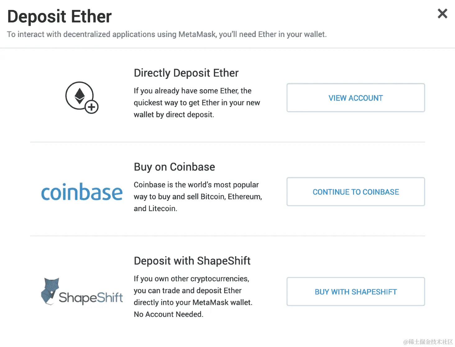 - 最后,它会提示你使用 Coinbase 或 ShapeShift,或者直接存入以太币: