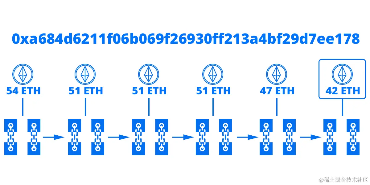 看起来很直观——一个钱包是你存储加密货币的地方——但实际上,钱包比它们看起来复杂得多。钱包连接到以太坊区块链,以查找您最新的余额,通过智能合约、dApps 或者通过区块链客户端本身访问。以太坊客户端下载整个链数据,它们能够搜索与您的账户相关的交易。其中一些将是转账,而其他可能是智能合约执行,您需要支付燃气。最后,只需读取最新区块中包含的与您地址相关的交易,就可以获得您当前的余额,如下图所示,余额在几次交易后被更新: