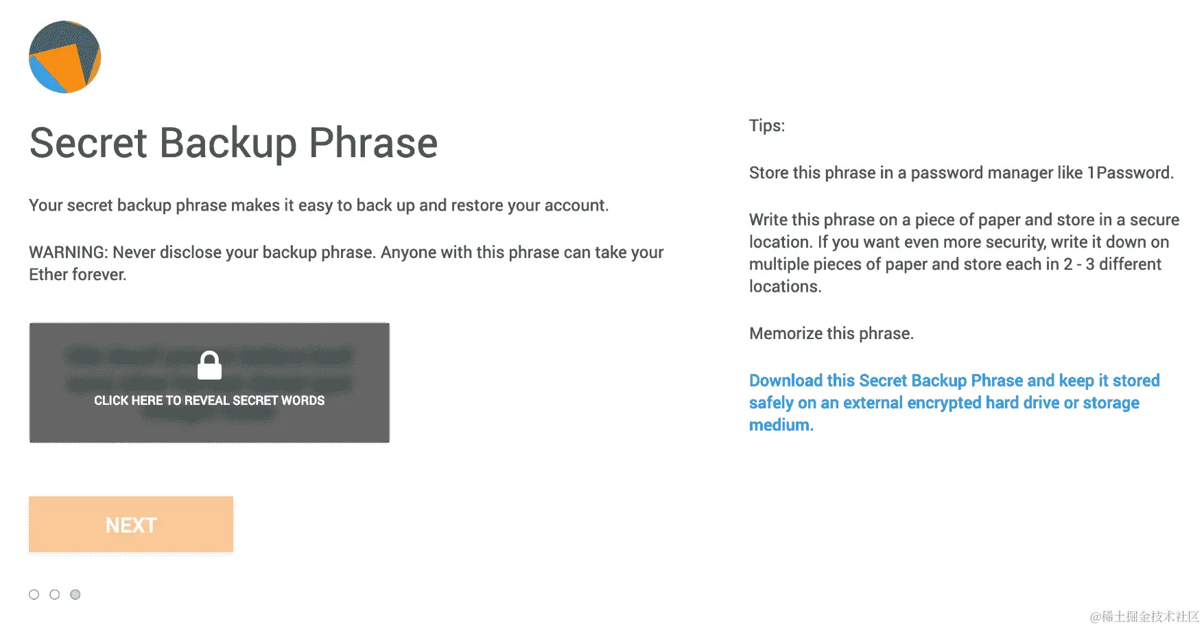 - 之后,它会向你显示不同的窗口,警告你使用像这样的测试软件的风险,并告诉你除非你完全确信这个过程,否则绝对不要将恢复种子提供给它们。然后,你需要点击并将你的种子短语存储在一个安全的地方。这是一组独特的单词,将帮助你恢复账户,如果你丢失了它。这是你的主要私钥,绝对不能丢失,否则你的钱包将无法访问: